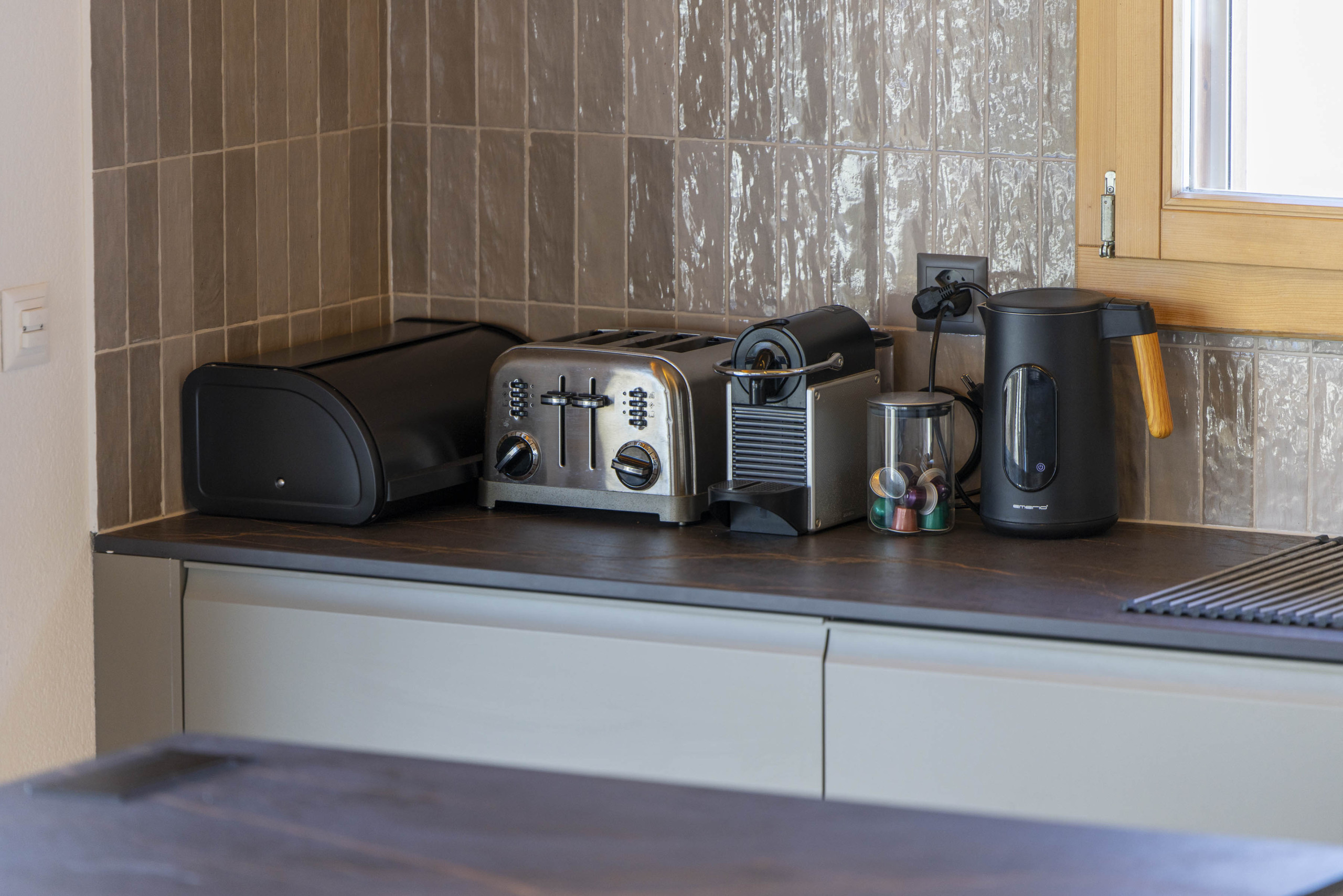 Fully equipped open plan kitchen, with a Nespresso coffee machine, oven, micro-wave, dishwasher.